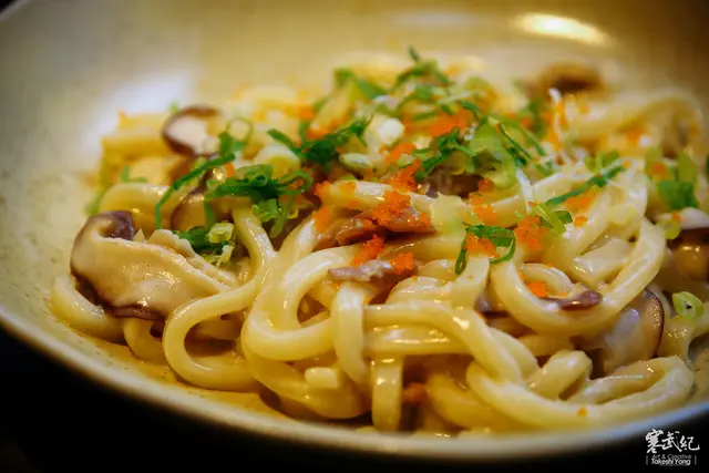 基地流白醬烏龍麵(160元):蔥花、蝦卵、香菇片灑落在白嫩Q軟的白醬烏龍麵上,濃稠且香氣圍繞在所有食材上,當晚上喝多了,來一盤白醬烏龍,吃飽後再戰!又是一尾活龍!