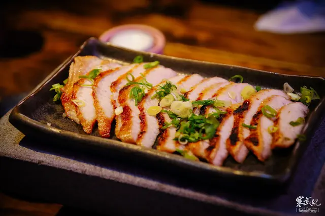 黃金六兩(240元):俗稱的豬頸肉,也是松阪豬肉,炙烤後切成小片,放在專屬石頭烤盤上簡單調味後上桌,外皮如黃金般的色澤,油脂分佈均勻,口感彈牙一級棒!