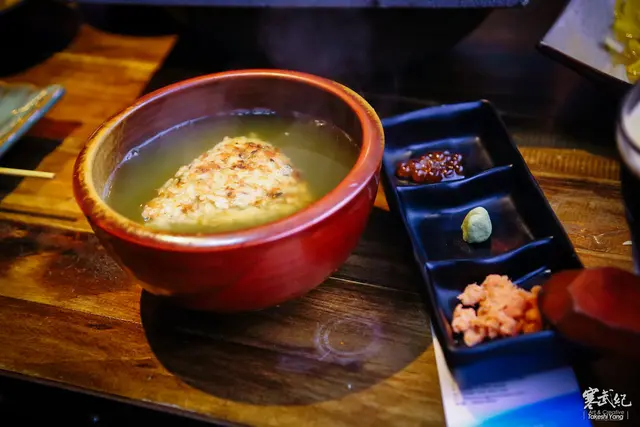 鮭魚茶泡飯(90元):整顆烤飯糰加入高湯汁,拌入碎鮭魚、鮭魚卵和芥末,熱騰騰的湯汁搭配炙烤過的米飯,太迷人了,酒醉七八分後最佳之醒酒良方!CP值高啊~~