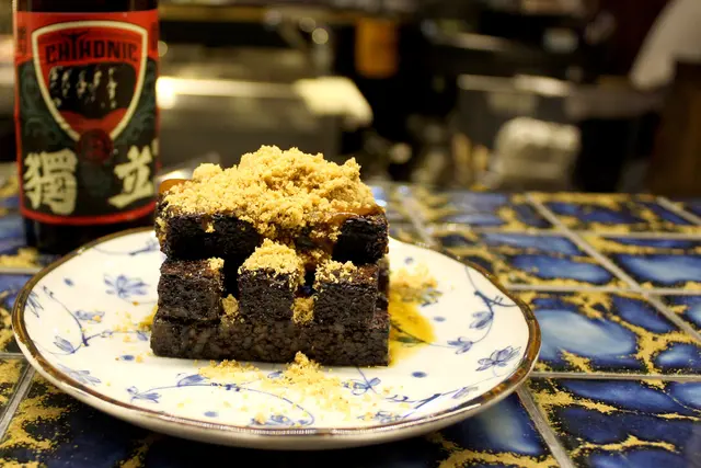 疊高的豬血糕塔上,滿滿的花生粉和店家自製醬汁,