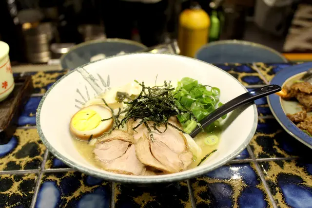 味增湯頭口味的烏龍麵上,滷蛋、蔥花、海苔和五花肉,
