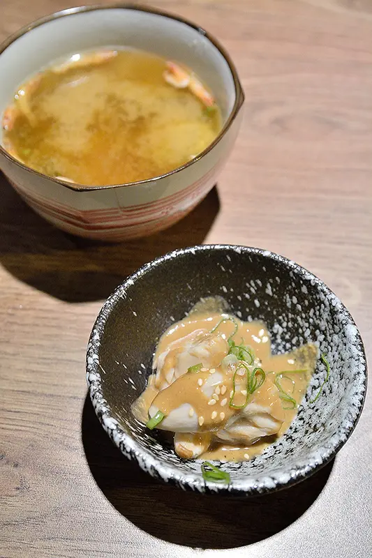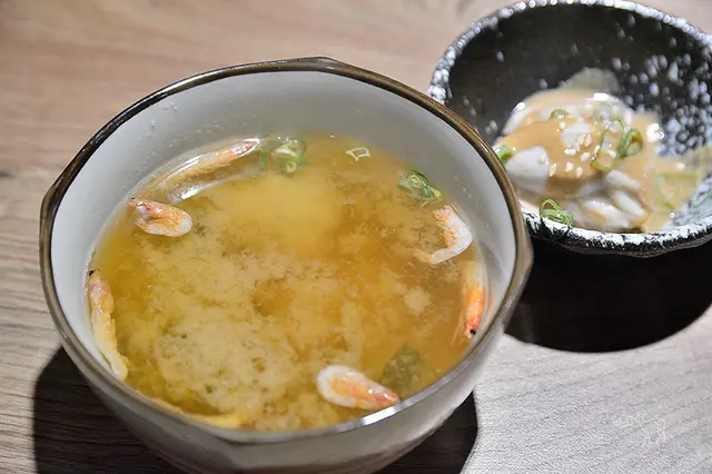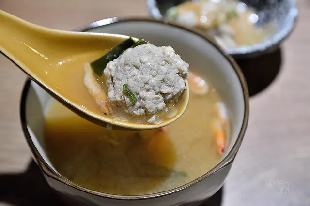 味噌湯也是附的,有些海帶芽、豆腐、櫻花蝦與手工雞肉丸,我覺得這樣的價格還提供手工雞肉丸很實在,而且雞肉丸不錯吃。