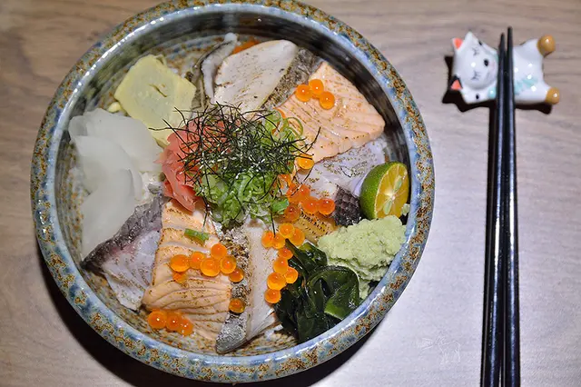 除了鮭魚卵、玉子燒、蘿蔔、海帶芽等,有鮭魚、穴子與其他兩種魚生,炙燒的香氣我覺得中規中矩,生熟度掌控的可以,整份也是價格平實且料多。