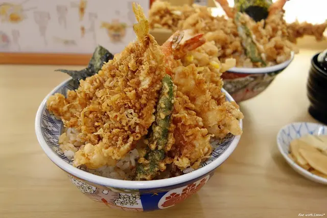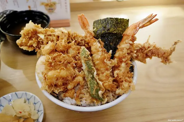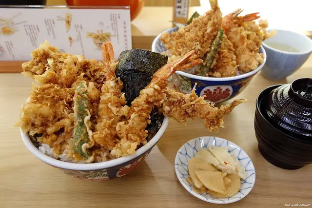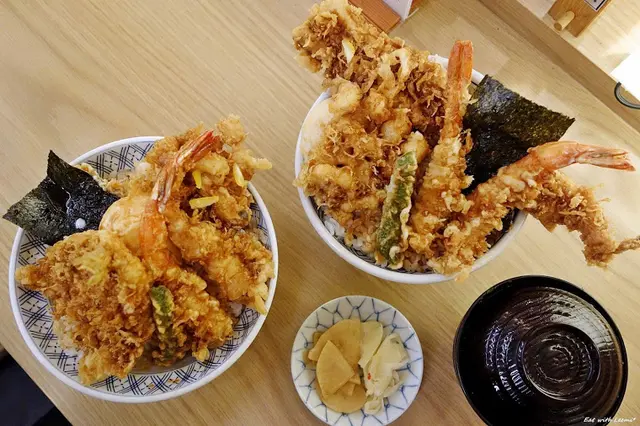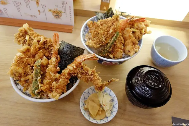和朋友分別點了江戶前天丼和上天丼,兩者的差別只有主食材不同,其他搭配內容是完全一樣的。