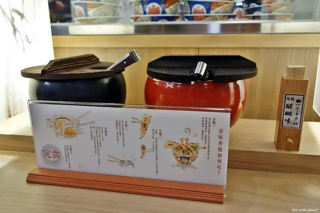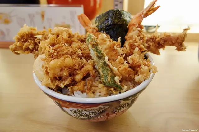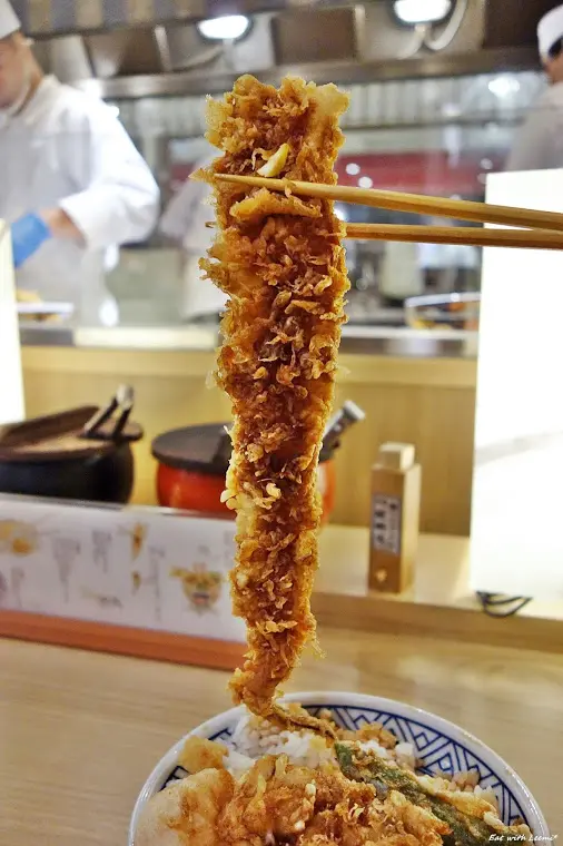 江戶前天丼獨有的整尾穴子魚(星鰻),超出碗緣的份量完全就是視覺焦點,帶一點厚度的穴子魚,肉質不像另一碗上天丼的主角鱚魚(沙梭)那樣細,而是咬下帶著點間隙的綿與鬆軟,倒也好吃,朋友認為接近魚皮的部位本身味道較重,自己是覺得襯上醬汁後其實沒太大問題,不過這碗比較可惜的是只擺上一小塊柚子皮,要體會清香與魚肉搭配的效果實在有限,兩尾蝦尺寸不大,口感倒還算飽滿,什錦海鮮炸較容易散開,分成小塊來吃口感雖然也有彈性,但就是少了那麼些爽快,青龍是不辣的糯米椒,炸過以後更顯甜味,另外還配上了一枚炸半熟玉子和炸海苔。