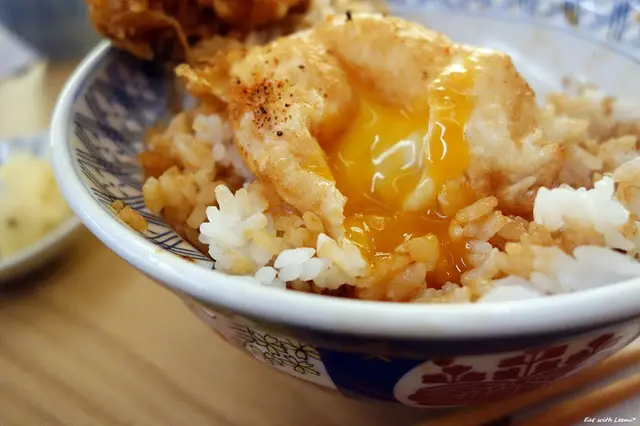 劃開半熟蛋讓蛋黃流瀉而出是這碗天丼另一個讓人期待的時刻,恰到好處的熟度讓這個動作執行地相當成功,蛋黃裹覆上混著醬汁的米飯增添些許溫潤風味,也緩和了鹹度,對大多數人來說應該都是難以抗拒的吃法。