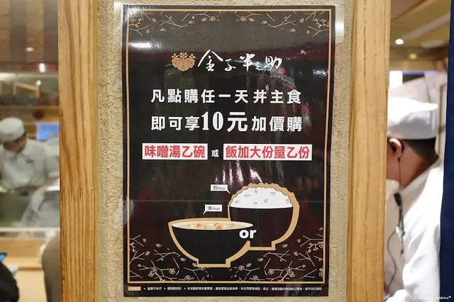 專賣天丼(天婦羅蓋飯)的金子半之助,菜單上僅有三種不同價位的天丼,不太複雜的選擇,其他項目則是飯量加大、味噌湯及飲品類等等,微風台北車站店有收10%的服務費,另一間林口三井OUTLET分店設置在美食街裏頭,採自助式點餐故無額外加收一成。本店位在東京日本橋的金子半之助,能成名除了熱門電視節目的推波助瀾外,和它的價位與內容物在當地能被認為是物超所值有關,移到台灣後用本地物價來看就可能不是那麼漂亮的數字,不過不同的地方有不同的定價理由,能接受的人自然就會去嚐試。