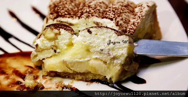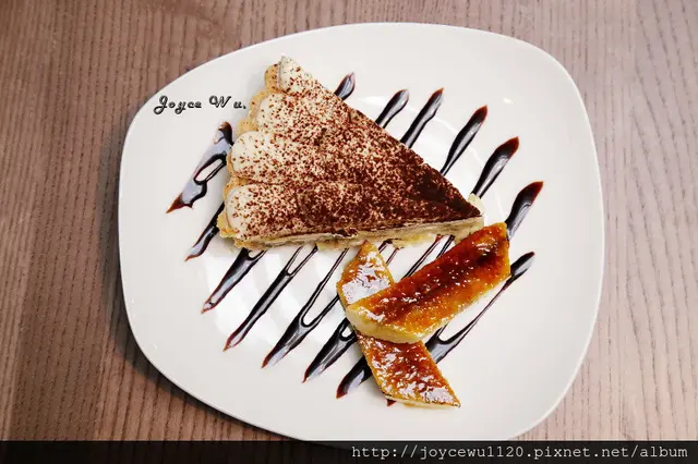 名字中有巧克力派是因為加了巧克力醬在盤中嗎? 還是灑了可可粉在派上?