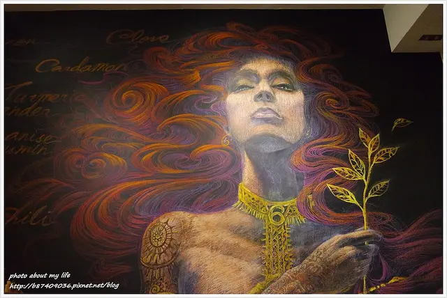 進門就看到仿若女神的壁畫 睥睨眼神和紅色大卷髮都栩栩如生 超酷!