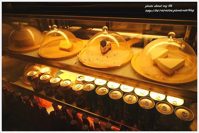 後方是製作飲料和輕食點心的吧檯 旁邊玻璃櫃裡展示各種手工甜點和啤酒