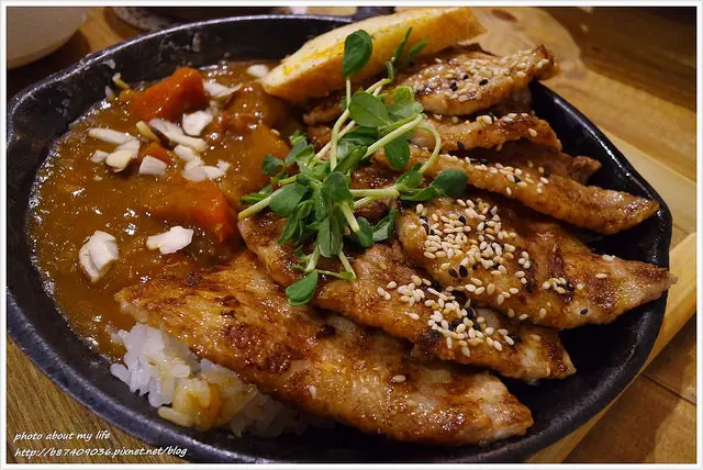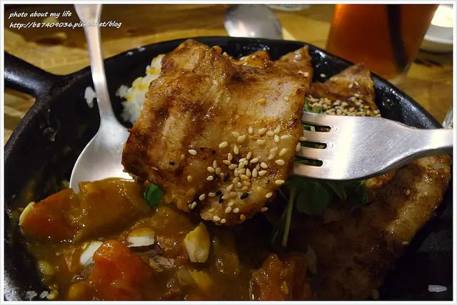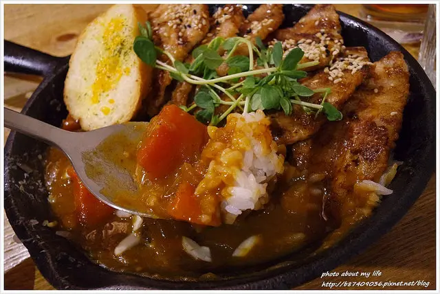 用燒燙燙的鐵鍋盛裝咖哩除了極佳的視覺效果外 鍋邊的白飯還會有像鍋巴的微焦色澤!