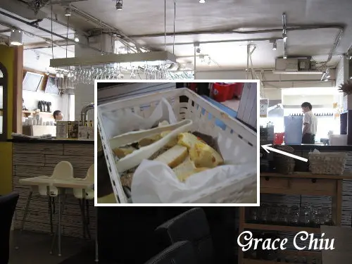 接著開始等~覺得候餐時間比之前來訪久了許多,但當時店裡只有二名店員,想說雖然當時店裡客人不多但或許前面的客人只是剛好比我早到一點所以在備他們的餐,選擇靜候不催促,後來來了一組五人顧客進店坐在我附近,看他們等人到齊後討論好要點的餐點再到櫃枱點餐回座我的餐都還沒來,等太久索性到自助區取用麵包.