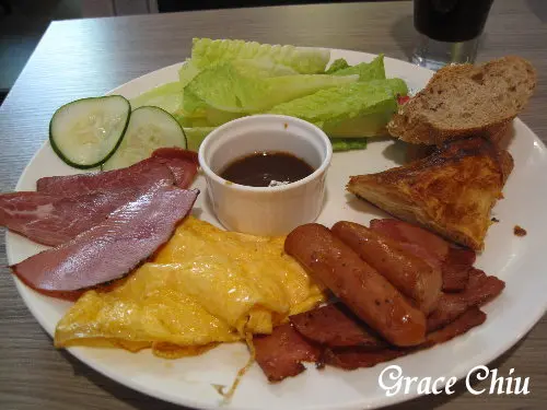 熱情早點到(200元)~煙燻牛肉.德國香腸.培根.炒蛋.鮮蔬沙拉.麵包/沙拉~蘿蔓沾中間附的沙拉醬味道鹹香清爽/肉品類~除了培根比較鹹一點外煙燻牛肉及德國香腸鹹度都適中,煙燻牛肉肉質濕潤不柴.香腸口感Q彈/炒蛋~我是看之前拍的菜單內容寫的,不知是不是有換過內容,這次吃到的蛋是煎整片然後對折再對折盛盤,比起炒蛋我更喜歡這次這樣的煎蛋/麵包~有歐式麵包片及半份的酥派麵包.