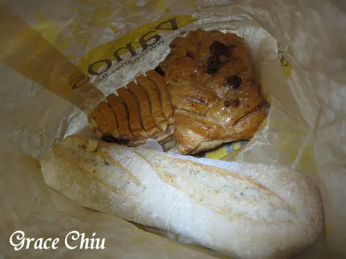 酥派,麵包~個人最喜歡的是右下角拍的那款,有嚼勁,店裡對麵包包裝方式好像沒有統一的標準,有一二次是有像右下角這樣個別裝袋,但大部份時候是全都裝進一個紙袋,某次同時買歐式麵包.楓糖胡桃捲及覆盆莓酥派也是全都裝在一起,不反對裝一起的環保包裝模式,但覺得若能稍微分類一下會比較好,不然像楓糖胡桃跟其他麵包放一起就把其他麵包弄到有些沾手感了.