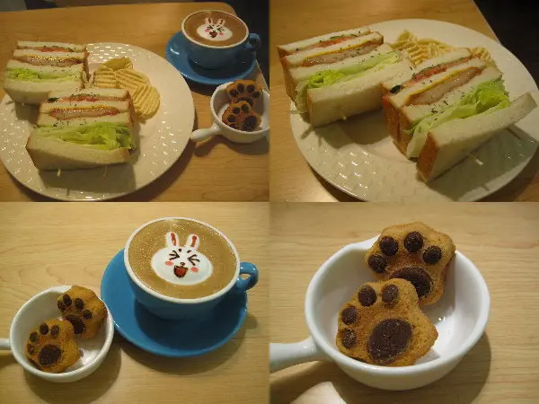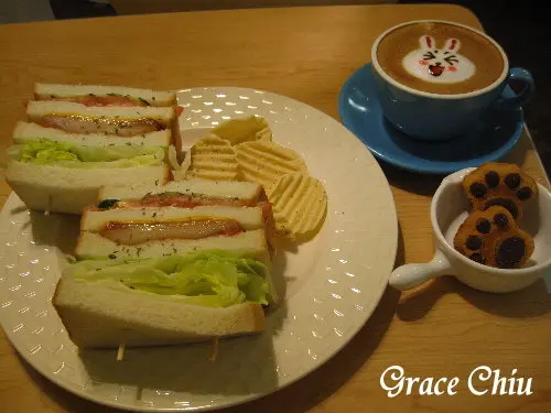 初訪我點了份烤腿排總匯再加一杯立體兔兔卡布,在等候期間看到櫃枱瓶子裡的可愛喵掌瑪芬忍不住加點二個.