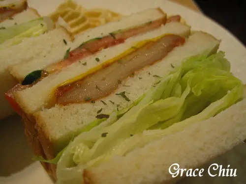 畫圖咖啡現點現畫需要一些製作時間,加上還有比我早一些抵達的客人也有點其他畫圖咖啡,所以等待的時間又再拉長了些,烤腿排總匯及喵掌瑪芬先上桌,烤腿排總匯的肉吃起來甜甜不油膩,搭配了一片起士,上下層吐司間夾了生菜.蕃茄片及小黃瓜,整份餐點呈現清爽的視覺.