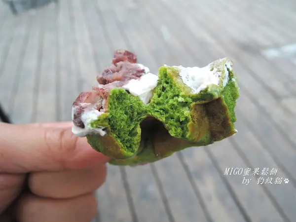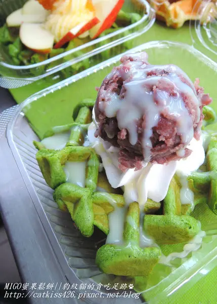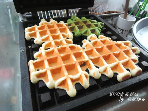 【MIGO蜜果鬆餅】特別之處就是改良過的比利時鬆餅,少了過硬的脆度,多了綿柔的彈勁。麵團主要食材,麵粉、牛奶,雞蛋、奶油和珍珠糖,再以天然酵母發酵,沒有添加人工香料。簡簡單單,卻是自然的純粹原味。