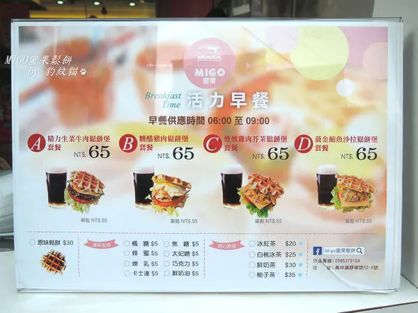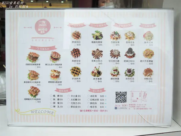 研究了一下菜單,【MIGO蜜果鬆餅】鬆餅口味還算不少,甜的、鹹的組合都有,看起來都很可口呢!售價非常親民,基本款原味30元,其他風味鬆餅最高也才55元,花個銅板就可以享用比利時鬆餅,阿貓興奮之情再也難以壓抑。