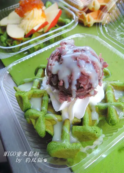 抹茶控要趕緊看過來,加入抹茶粉的鬆餅,有著優雅的茶香與麥香共舞。自煮紅豆餡綿密細緻又甘香,再淋上些許煉乳卻又不會過甜而生膩,絕讚!店家有個貼心細節,會事先分切好鬆餅,讓客人取用時輕便不沾手,邊吃邊逛都可以維持氣質呢!