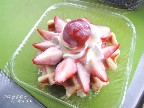 【MIGO蜜果鬆餅】在不同時節都會有特別的當季創意巧思,阿貓碰巧趕上草莓季尾聲,當然不能錯過限定商品。酸酸甜甜的新鮮草莓和煉乳你儂我儂,真是幸福的甜蜜點心。最威的是頂端那顆手工草莓果醬,沁心的莓香在入口瞬間整個大爆發,聽說是老闆尋找許久的秘密武器。