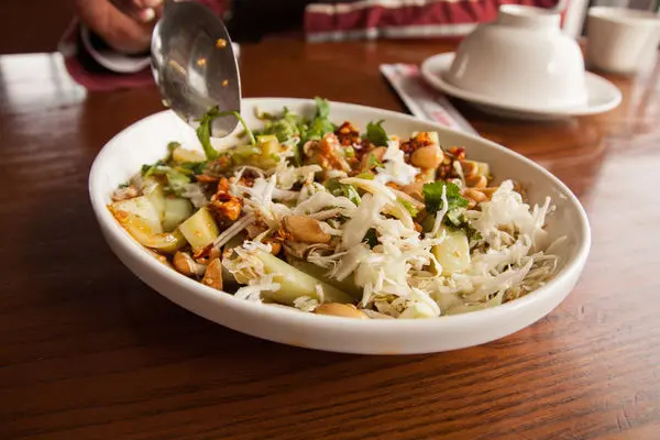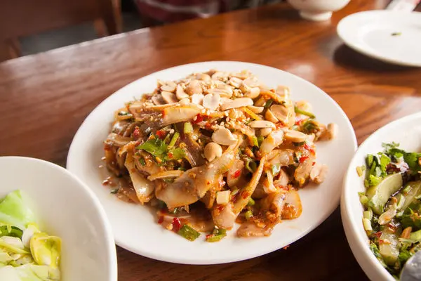 涼拌豌豆粉:200元。人數不多,便點小的試試。豌豆粉類似較厚實之粄條,白裡透綠,顏色十分討喜。拌上花生碎、香菜及特製醬料並食。辣味與一般泰式料理相近,但多了一點鮮香,鮮為香菜增鮮,香為花生脆香。