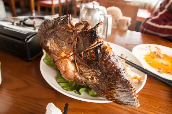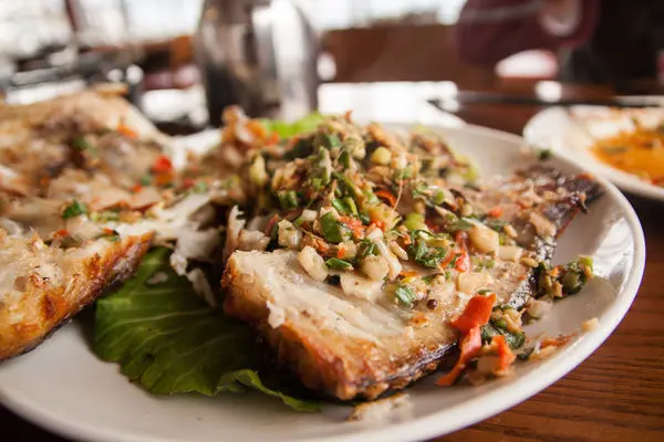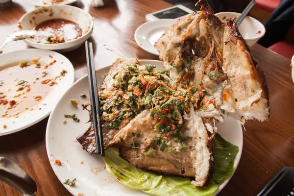 傣味包料魚:500元吳郭魚剖開,塞入香料,先炸後烤。雖然價格不斐,但的確是費工的一道菜。魚中香味撲鼻,魚肉被香氣沈浸其中,毫無腥味。但外焦內乾,肉質稍硬,口感不甚討喜。可能如此繁複之作業下,火候與時間較難掌握,有點可惜。若是增添香料之汁液,或許可外酥內軟。推薦度:覺得還好。