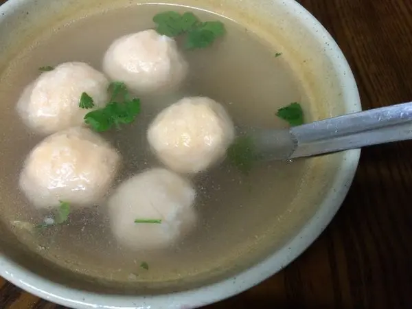 櫃子上面放著滿滿的湯料,大多都是丸子。被滷鍋遮住的地方也是,有不少新鮮的豬小腸跟豬大腸等等。我就看見了老顧客點了大腸湯,那大腸煮得鮮白微亮,感覺十分新鮮。來吃的朋友不妨到攤位上選料下湯,大快朵頤。