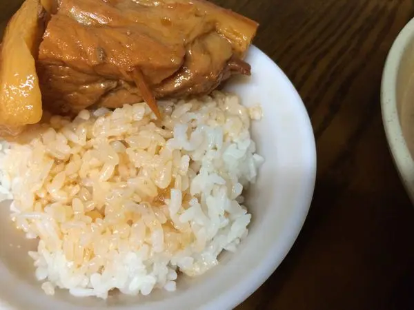阿本爌肉飯的爌肉是紅色的,第一次吃的人可能不太習慣。但整體入味不深,也有一種紅色醬汁特有的甜味。些微的甜味讓皮跟肥肉不那麼膩,瘦肉部分入味不深,但內部有肉汁。感覺得到阿本爌肉飯的豬肉肉質不錯,肉有味而不腥多汁。用十字固定法滷爌肉,更加牢固,也很新奇。