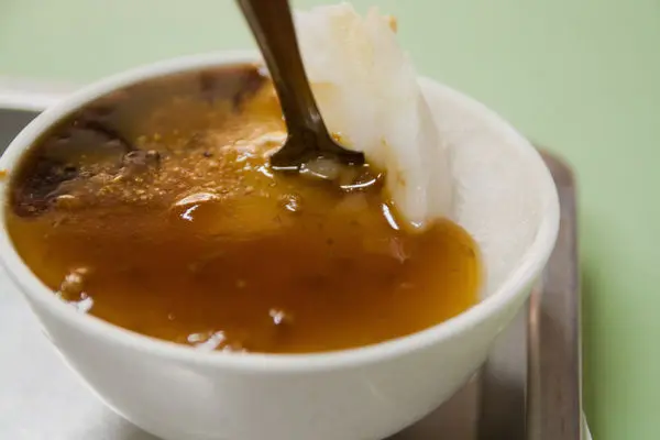 碗粿:35元。杉行的碗粿以較為清淡的味道呈現,雪白的在來米漿單吃亦有米的香氣。米漿做成的粿可沾上帶著蒜泥的醬油調醬,或是配上一口裡面帶著甜勁的肉餡,皆是十分適合。碗粿這食物極適合當早點,尤其剛起床時,腸胃仍在甦醒中,這樣不慍不火的米蒸小吃,最適合當作一天的第一餐。
