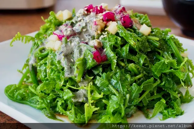 醬汁是胡麻醬加上些蘋果火龍果粒