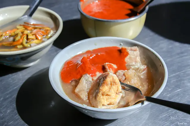作為早晨的第一餐,我這回沒有嚐試包了許多珍料的大肉圓,而是選擇了一般的小肉圓。小肉圓在上桌時並沒有加上紅醬,而是只加了吃起來帶點甘味的蒜味醬;紅醬(海山醬)則是放在各個桌上,有需要的人可以自己添加。
