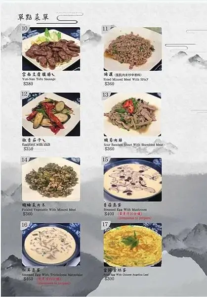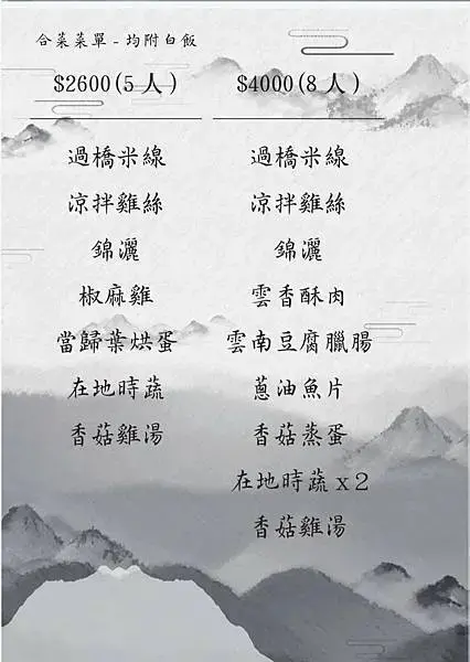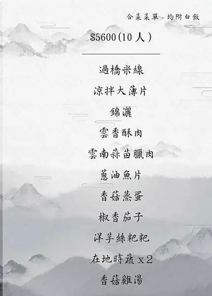 雲香園菜單主要分成:合菜或者單點雲南料理,所以,用餐人數多時,就可以點合菜,有5人、8人以及10人等……,像我們倆個人,就可以選擇單點部份,來到雲香園用餐,當然,要來上一鍋熱呼呼配料多的過橋米線,餐廳的店員,對於第一次來的客人,也都會詳細親切介紹,點餐完畢後,梅子就跟老爺話家常。