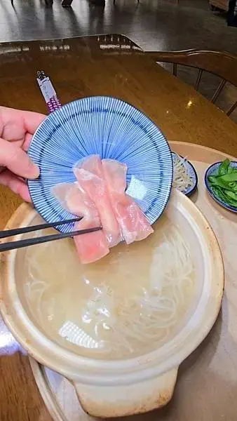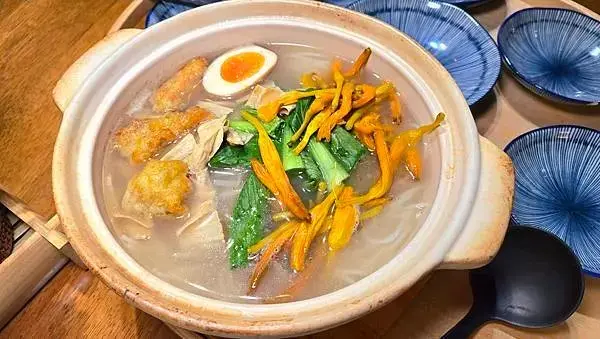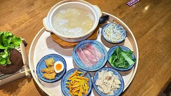 過橋米線:梅子開始自己DIY,添加肉片、配料、蔬菜……等下去湯頭裡面涮,還附上半生熟的溫泉蛋,超豐富