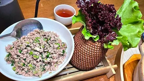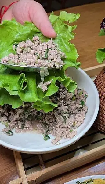錦灑:是用香料跟豬絞肉一起炒,舀一匙多層次豬絞肉,包著生菜一起品嚐,有著豐富多層次口感,肉質很紮實,不死鹹,這道餐點是看著蠻多饕客都有點這道,梅子才跟著一起+點,意外讓老爺很喜歡。