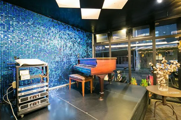 角落有小舞台、音響設備與一架鋼琴,原本前餐廳留下來,老闆將其保留,