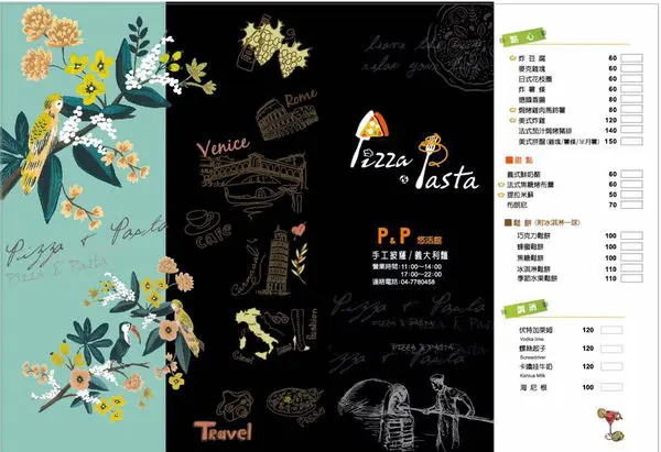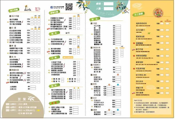 供應手工披薩、義大利麵、排餐佐麵、飯食、火鍋、焗烤、飲品、點心,