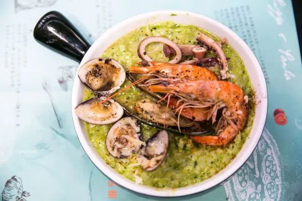 燉飯份量多,醬汁比較稀,飯的口感稍軟,有點像粥,和了白醬的青醬濃郁度淡些,
