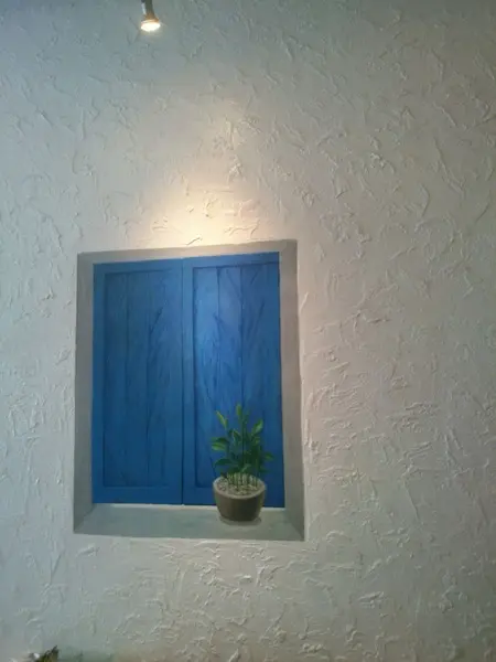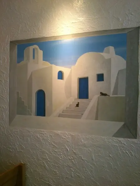牆上的壁畫也是希臘有名的白屋和貓咪畫…