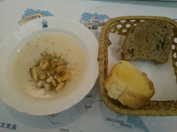 第二個來的是濃湯和麵包…這就拉回了我的評價囉…濃湯料多實在香濃好喝…麵包竟有2種口味,個人偏愛有口感的雜糧麵包~