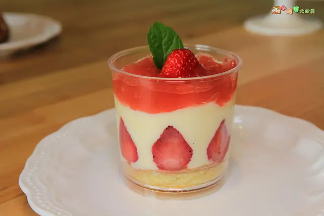 草莓果凍、新鮮草莓、蜜草莓,最底層還有細緻的蛋糕體。