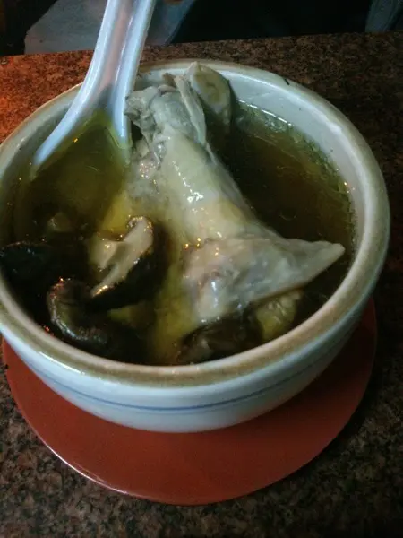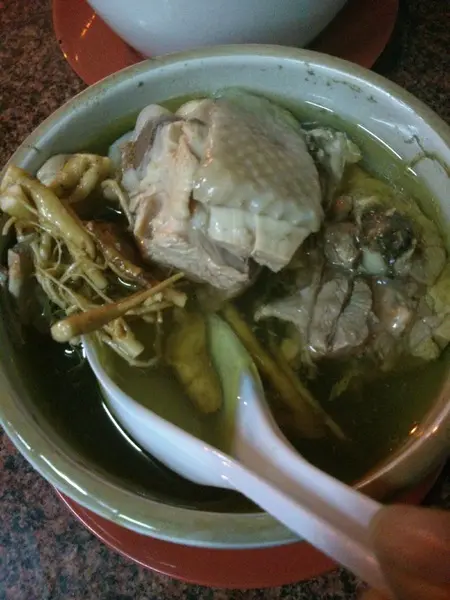 這碗是"不知道先生"的 九尾雞湯,中藥香氣十足…你看那大把的中藥材放的可不手軟,聽不知道先生說這個中藥材對身體很好,他都會吃進這個中藥材細的部份,粗的也會啃食一番才吐出殘渣。補氣還是什麼的樣子…我忘了!