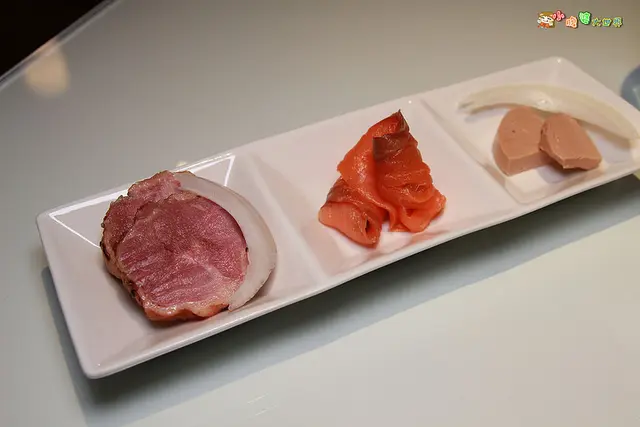 ▼哈娜朵朵,前菜由左而右:櫻桃鴨、燻鮭魚、鵝肝醬。