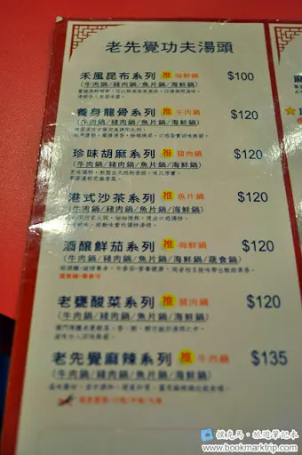 聽完服務人員的介紹,大致上瞭解老先覺的選鍋及消費方式,簡單來說;老先覺除了七大湯頭鍋:禾風昆布鍋、養生龍骨鍋、珍味胡麻鍋、港式沙茶鍋、酒釀鮮茄鍋、老甕酸菜鍋及老先覺麻辣鍋之外,亦可選擇鍋料較豐富的組合鍋、海陸鍋、主廚推薦鍋,可單點火鍋配料。而最基本的火鍋組合,主食可選擇牛肉、豬肉、魚片、海鮮其中四種,而副食為白飯或冬粉。