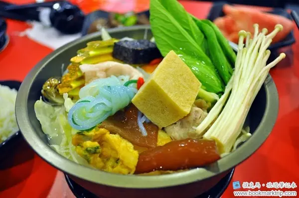 火鍋料有蒟蒻、凍豆腐、黑輪、高麗菜、貢丸(包芋頭)、冬粉、魚板、米血、金針菇、蛤蠣