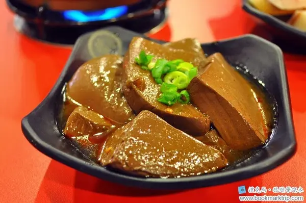 招牌滷鴨血,口感滑嫩,有Q度,帶點微辣,搭配一點點蔥末,提供整體風味及口感,適合配飯