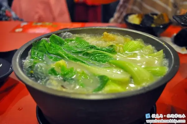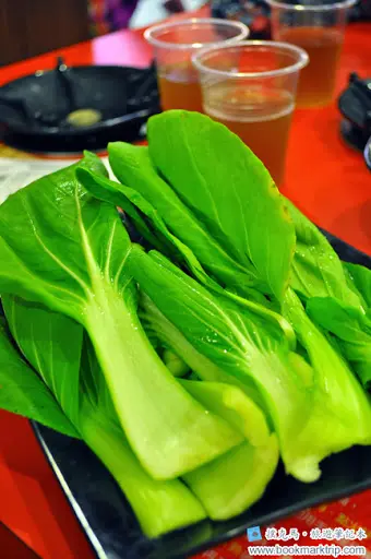 在優惠券的使用下,我們最後點的餐點包括養生龍骨魚片鍋(附贈招牌滷鴨血、梅花豬肉)、麻辣+鮮茄組合鍋、單點白飯一碗,另外由店家活動期間消費即贈送的一盤小菜(青江菜),櫃檯買單後,便等待餐點的到來。