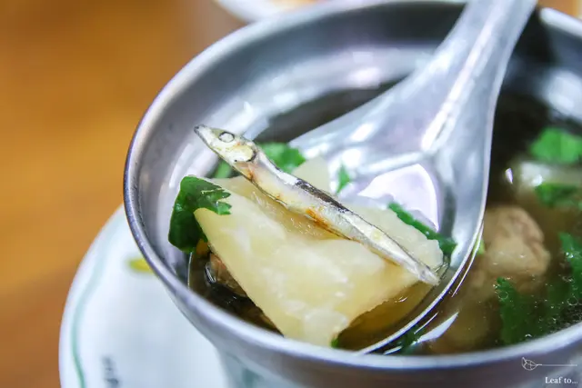 撈到底部時,就和大部分的做法一樣,放入了小魚乾,也更能提出甘味吧。所以記得要喝之前,可以稍微將底部攪拌至上頭,不然喝到最後會有些過鹹喔。