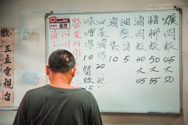 黑豬灶爌肉飯菜單是寫在白板上,爌肉飯小碗的只要45元,白菜滷可以做湯或乾的,一份只要20元,味增湯更只要10元,真的很佛心誒