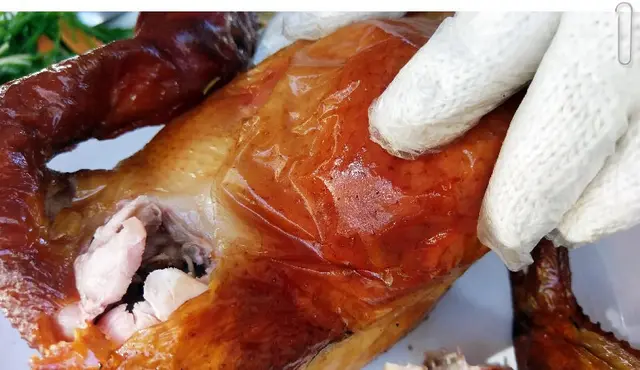 烤雞真的很燙,小李已經戴手套了,還是被剝開後的熱氣跟雞肉的汁燙到