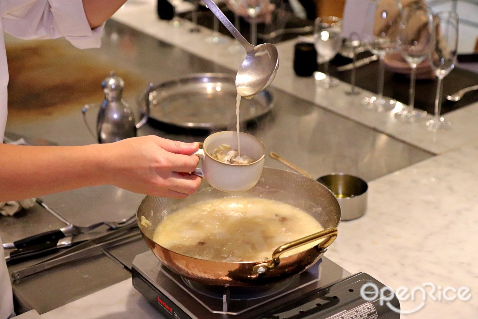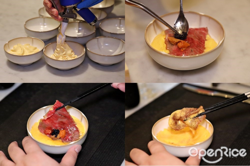 另一大亮點「夏多布里昂和牛A5 佐慢熬牛骨汁」取自菲力核心部位,一頭牛僅能取約600克,肉質柔嫩細膩,油花均勻,瘦肉香氣中帶有脂肪的細緻甘甜,入口即化,在師傅巧手之下與靜置時間的精準掌握,約五分熟的和牛塊,讓人著迷堪稱奢華代表。